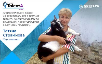 Переселенка з Донбасу Тетяна Страмнова почала виробництво козячих сирів, бо не знала, що робити із молоком. Але поступово аматорський проект переріс у власну торгову марку сирів. І зараз Тетяна хоче розширити ферму та залучити до піклування за тваринами дітей-аутистів, яким це допоможе соціалізуватися. Заради цього вона й змагається за грант програми TalentA, ініційованої компанією Corteva Agriscience для жінок-фермерок.