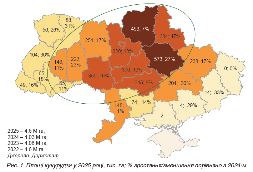 На рисунку 1 видно, що найбільші площі кукурудзи сконцентровані в Полтавській, Чернігівській, Черкаській, Кіровоградській, Вінницькій областях. Сезон-2025 ознаменувався стабілізацією площ під кукурудзою та поверненням її на історичні території: зменшення площ на півдні та сході компенсувалося збільшенням у центрі та на заході. Диверсифікація експортних шляхів, стабілізація на ринку енергоносіїв та вдосконалення логістики сприятимуть подальшому поверненню площ кукурудзи на довоєнний рівень.