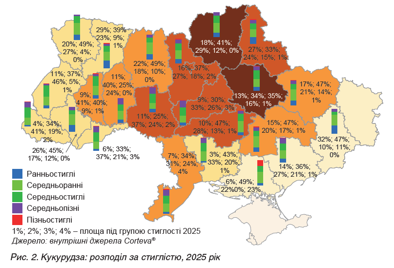 На рисунку 2 видно, що найбільші кукурудзяні площі сконцентровані під середньоранніми та середньостиглими гібридами – >50% усіх площ. Це обумовлено тим, що гібриди з ФАО 260 – 340 не мають обмеження щодо території вирощування та забезпечують найоптимальніший баланс урожайності й збиральної вологості. Ранньостиглі гібриди є популярними в північних та західних регіонах України. Середньопізні гібриди популярніші в центрі та на півдні.