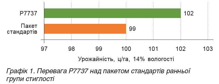 Аграрії Полісся знайдуть у ньому потужний ранньостиглий гібрид лінійки Optimum® AQUAmax® Р7818 (ФАО 240) та його адаптивного «напарника» Р7552 (ФАО 230). Для посівного та збирального конвеєра, беззаперечно, підійдуть ультраранній Р8115 (ФАО 210) та Р7655 (ФАО 220) – гібриди, які ідеально підходять для виробництва силосу, однак і при вирощуванні на зерно також забезпечують конкурентні результати. Окремо хотілося б зупинитися на новинці 2026 року. Р7737 (ФАО 220) – гібрид, який всебічно тестувався на внутрішніх випробуваннях останні 3 роки. Р7737 показує урожайність на рівні відомого Р7818 лінійки Optimum® AQUAmax® і адаптивність на рівні Р7552, що робить його доволі привабливим для поціновувачів ранньої сухої високоврожайної кукурудзи. Р7737 на внутрішніх дослідних випробуваннях протягом 2022–2025 років (понад 60 точок випробувань по всій Україні) забезпечив урожайність на 3% вищу, ніж пакет стандартів, до якого належать найкращі та найурожайніші гібриди поточного портфеля: Р7552, Р7818, Р8604, Р8754 (графік 1)