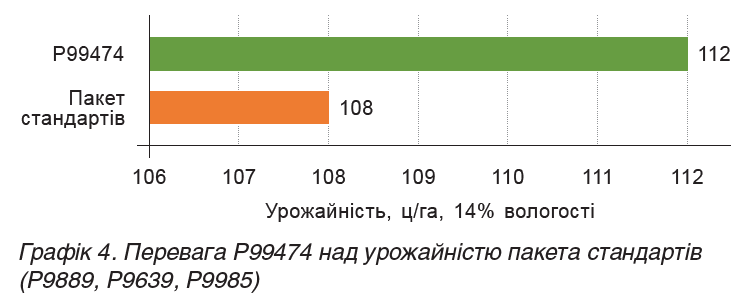 У зоні Степу аграрії мають широкий вибір: починаючи від адаптивних Р9757 (ФАО 390) та Р9639 (ФАО 360), переходячи до гнучких інтенсивних Р9241 (ФАО 360) та Р9903 (ФАО 390) і закінчуючи інтенсивними Р9889 (ФАО 380) та Р9985 (ФАО 370). Маємо в портфелі і середньопізній гібрид Р9967 (ФАО 370) лінійки М3, з якого виходить неперевершений силос. Новинка сезону-2026 – Р99474 (ФАО 370) належить до лінійки Optimum® AQUAmax®. Гібрид має високі рослини з оптимальним кріпленням качана та добре розвинену кореневу систему, що убезпечує від кореневого та стеблового вилягання. Відносно пізнє ФАО компенсується чудовою урожайністю і вологовіддачею (графік 4).