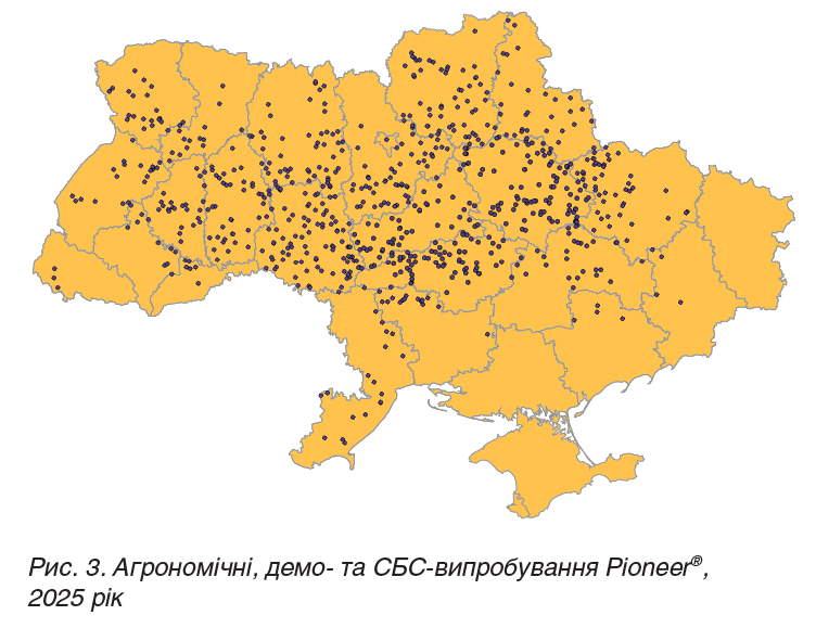 На рисунку 3 видно, що у сезоні-2025 Pioneer® мав понад 900 різних випробувань своїх гібридів кукурудзи по всій території України. Всебічний аналіз отриманих даних дає нам змогу наповнювати портфель тільки тими гібридами, які гідно себе зарекомендували з огляду на конкретні ґрунтово-кліматичні умови та особливості господарювання.
