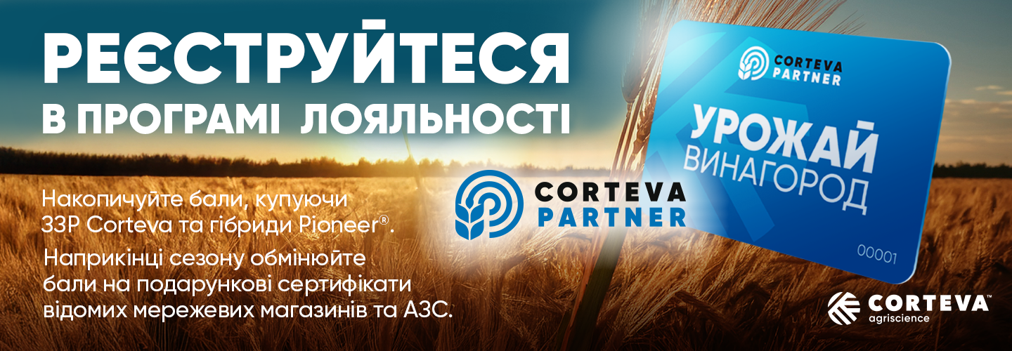 Програма Лояльності «Кортева Партнер»Corteva Partner – це спільна програма лояльності від ТОВ «Кортева Кроп Україна» та ТОВ «Кортева Агрісаєнс Україна», створена для сільгоспвиробників, які обирають якість і стабільність засобів захисту рослин Corteva Agriscience та насіння Pioneer®.